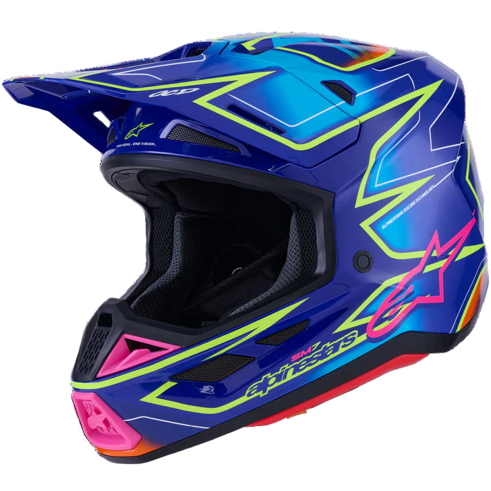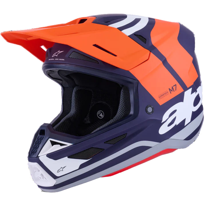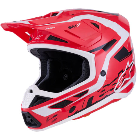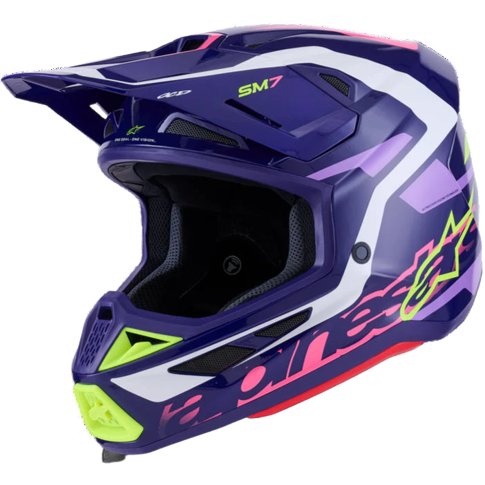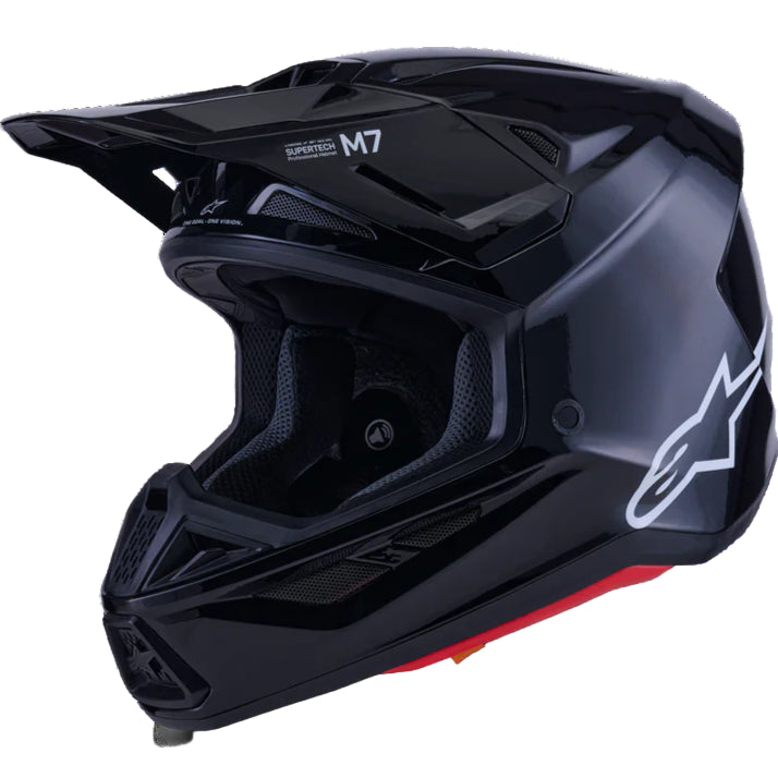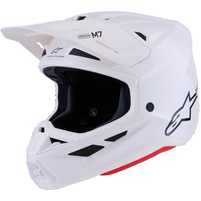The S-M7 Helmet is engineered for off-road racing, and is optimized to offer the perfect blend of superior ventilation and comfort in a lightweight helmet, while its supremely aerodynamic composite shell delivers exceptional impact protection. As well as Alpinestars patented A-Head Fitment and Visor Detaching Systems, the S-M7 is equipped with innovative PLASMA technology at the lower side of the shell edge for optimum energy dissipation in case of contact with the collarbone area.