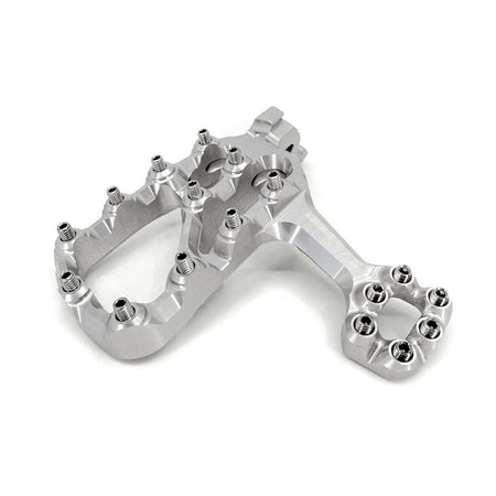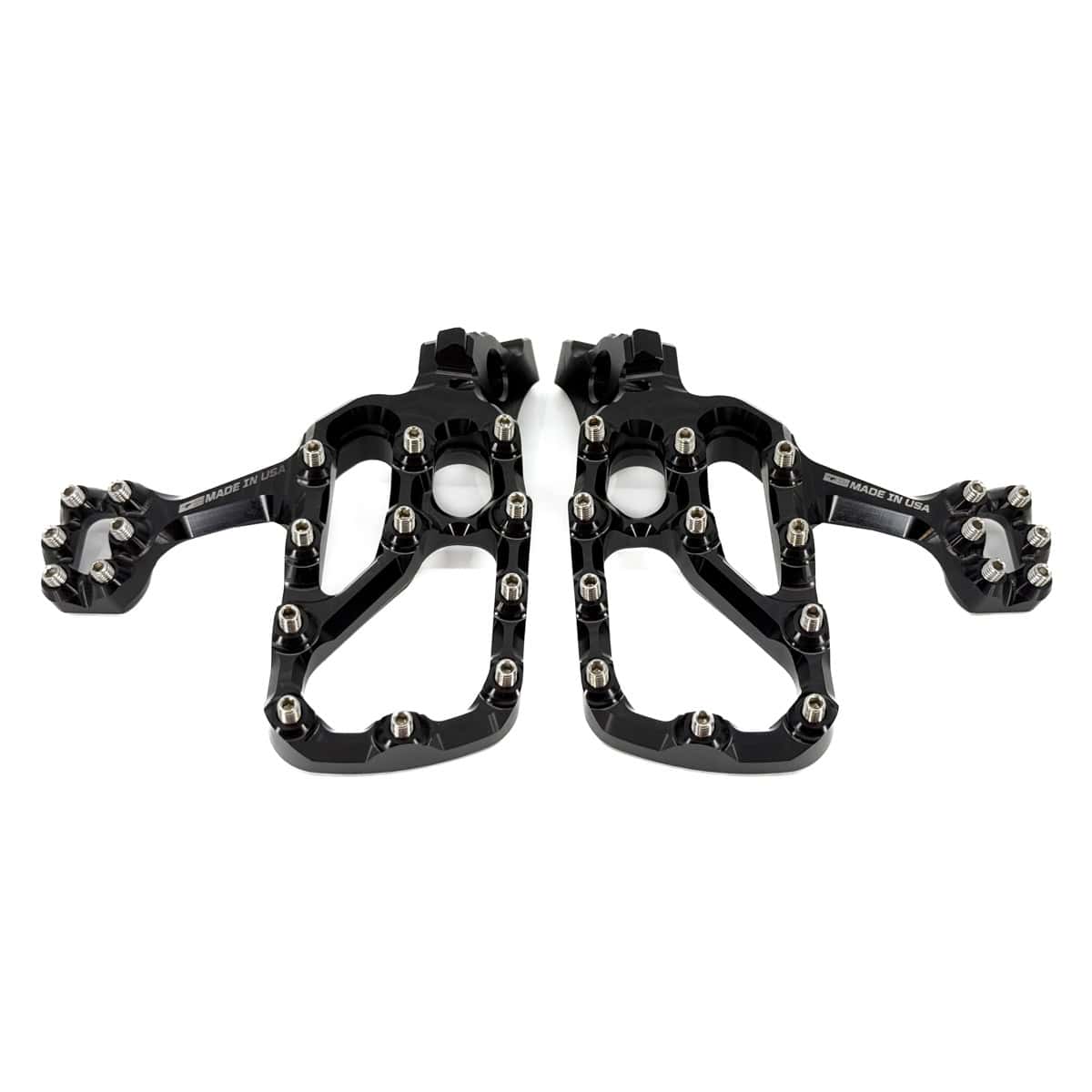 The Fastway EXT Footpegs are light, strong, fully adjustable, and precision engineered for the best ride, every ride! Machined In-House from U.S. Made 2024 billet aluminum which is Stronger and less brittle than 6061 Aluminum. The Fastway Foot Pegs are designed with slanted drafts to shed mud and debris while being ultra-strong. The traction surface has been modified to ensure the rider’s sole rests entirely on the cleats. Offering more available traction due to additional cleat on platform and measuring 2.25” front to back by 4.0” wide means the Fastway Foot Pegs are the perfect balance of size and traction for Motocross, Off-Road, and weekend warriors alike.