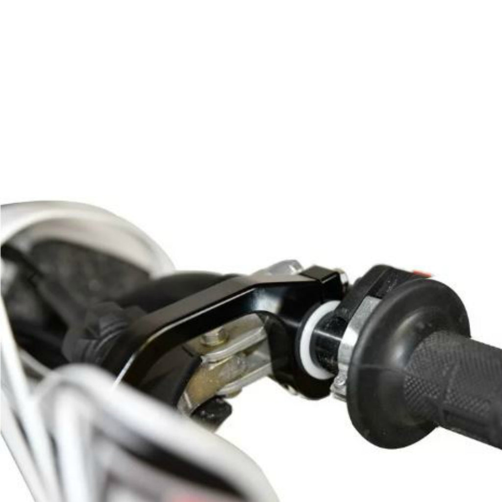 Forged, then machined aluminum mounts with Delrin bushings will rotate on handlebar in the event of a dismount to decrease chance of bending