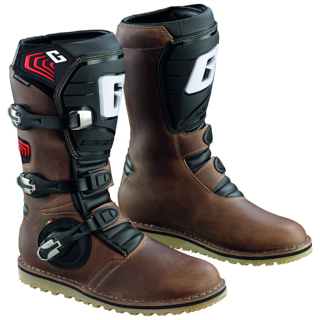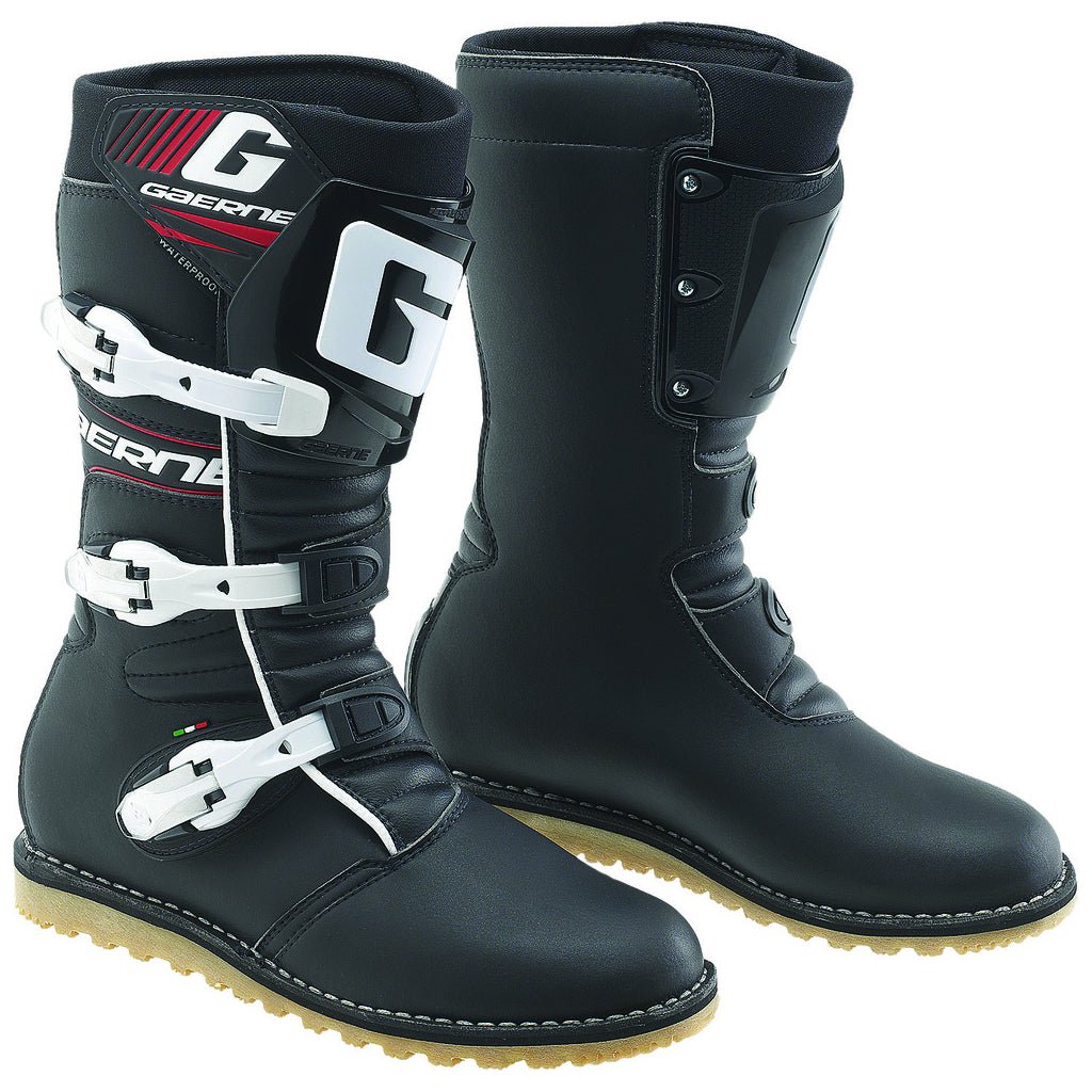 Classic: This new trial boot is made with microfiber to grant lightness and comfort. It features an injection molded front shin guard and three light alloy buckles, which are replaceable. it is also waterproof thanks to Gaerne Drytech Membrane. A gum rubber sole completes the task for a great feel and control of the bike.