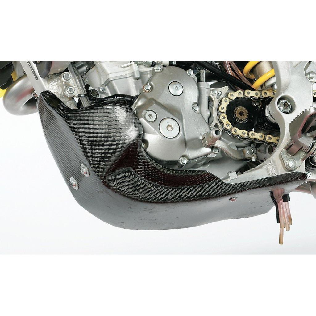Extremely lightweight carbon fiber composite construction, this skid plate has strength in all the right places to protect your cases and frame rails from severe damage. From alternator to water pump and cradle to linkage, this skid plate will protect everything in-between.
