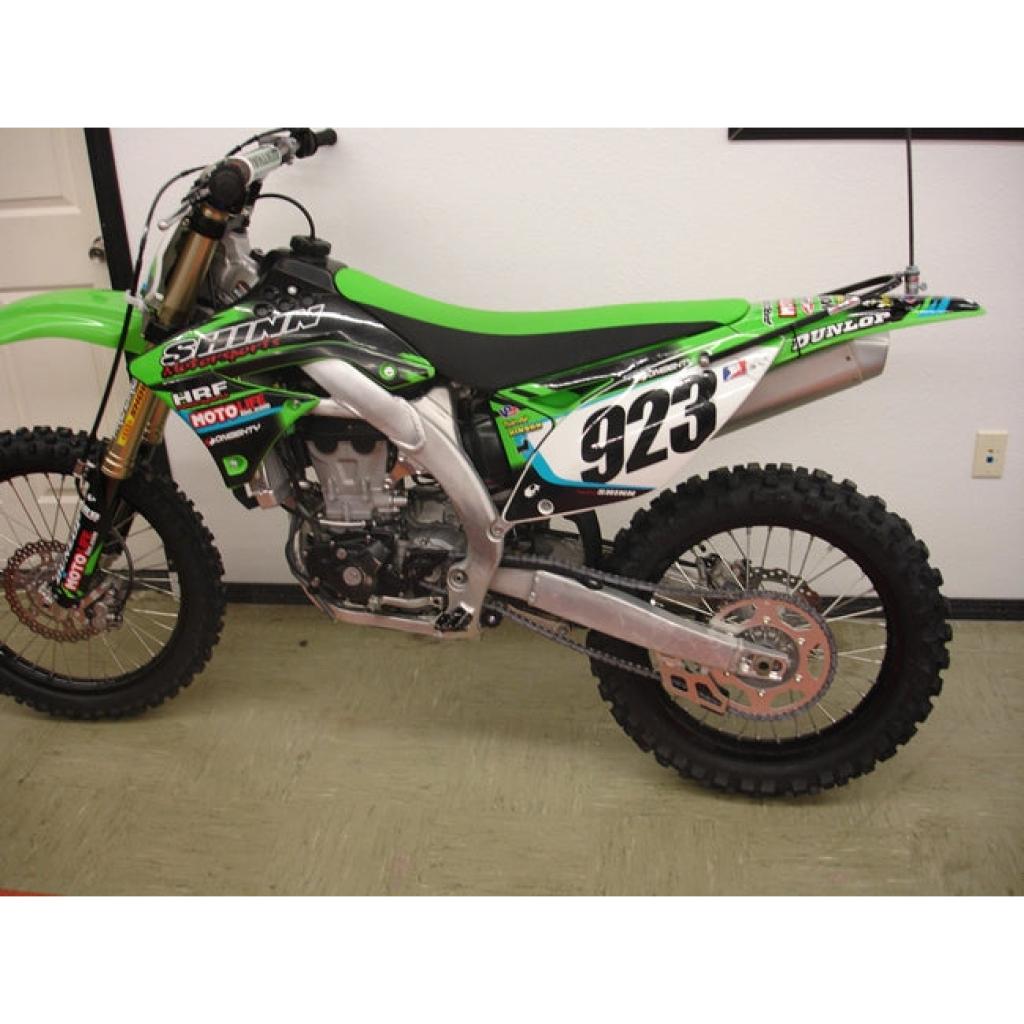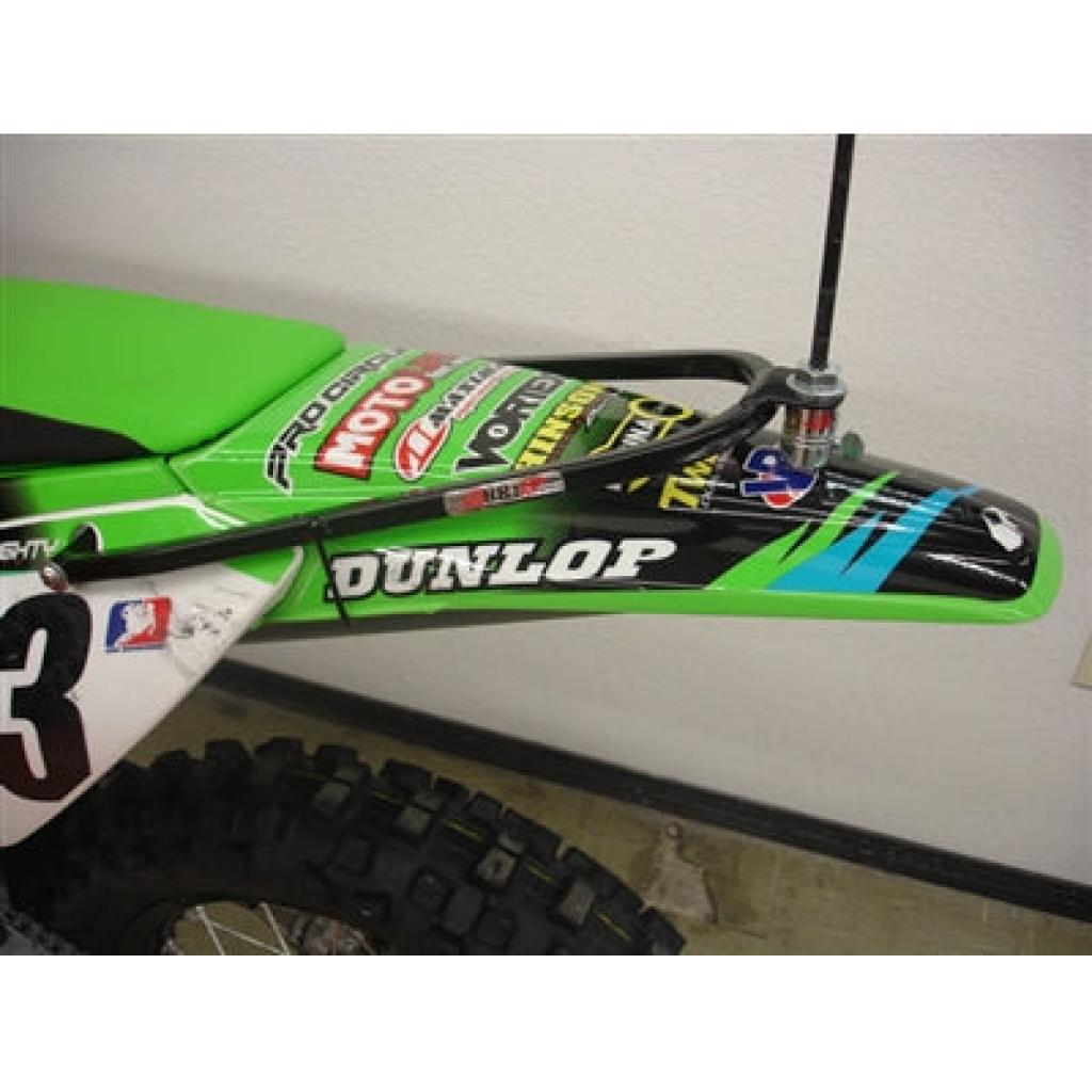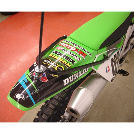 This HRF whip mount is designed to mount up to the seat bolt mounting points and then it hangs over the rear fender. Will work on KX125/250, KX250F/450F model dirt bikes.