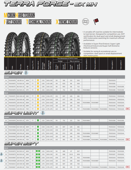 The Mitas TERRA FORCE-EX MH product line features multiple rubber compound & carcass options combined with terrain specific tread designs for maximum traction and legendary durability. Full height knob rear tire, race ready and DOT certified.