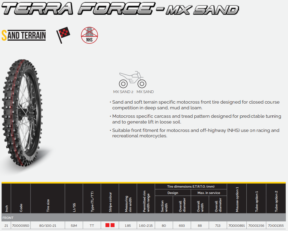 The Mitas TERRA FORCE-MX Sand Front is the direct result of racing and development in the famous sands of the MXGP Motocross series.