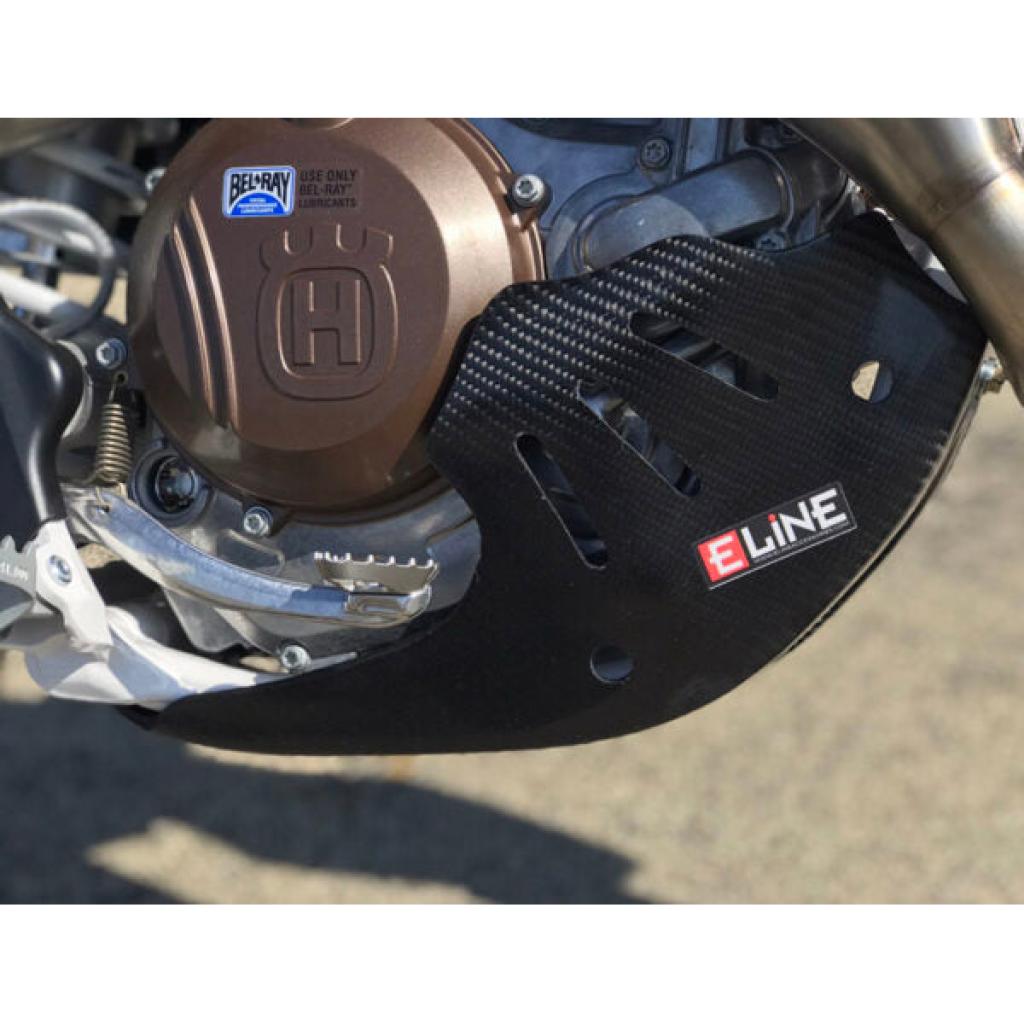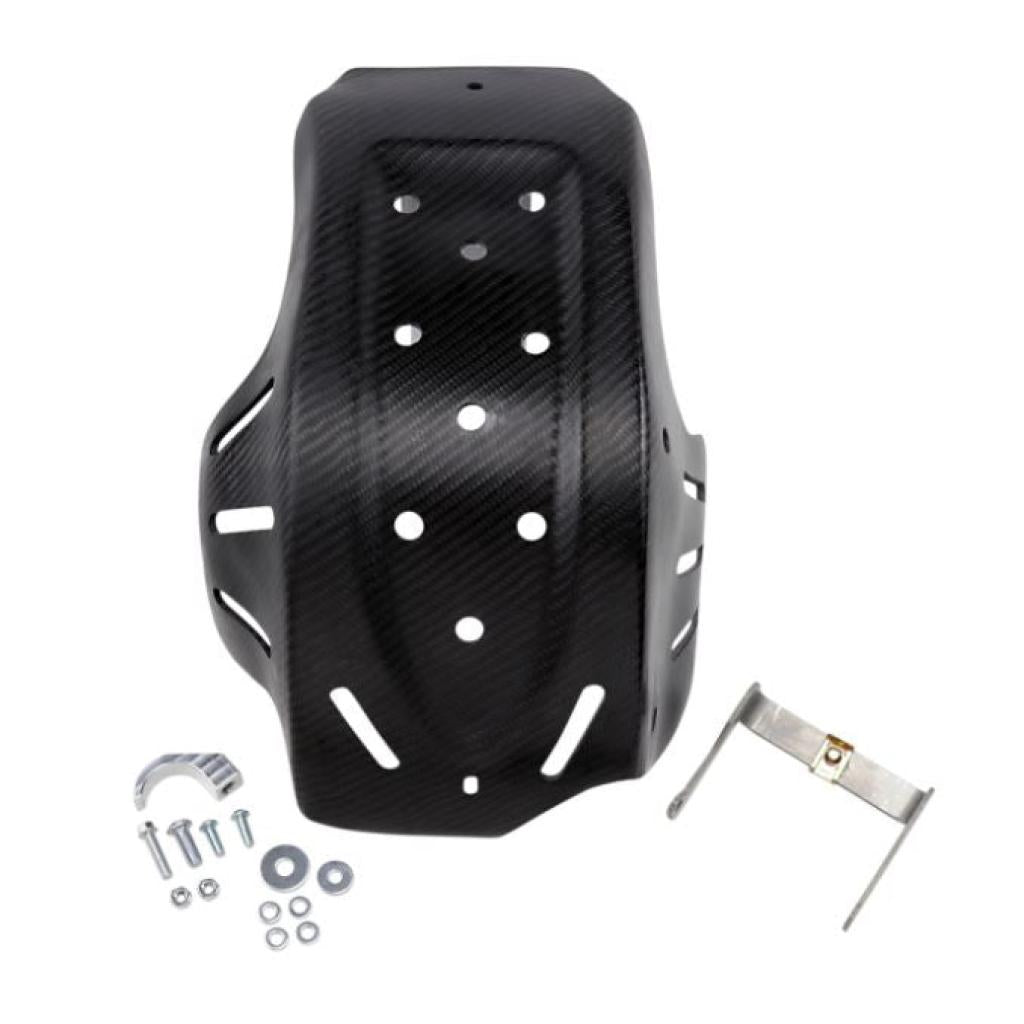 Extremely lightweight carbon fiber composite construction, this skid plate has strength in all the right places to protect your cases and frame rails from severe damage. From alternator to water pump and cradle to linkage, this skid plate will protect everything in-between.