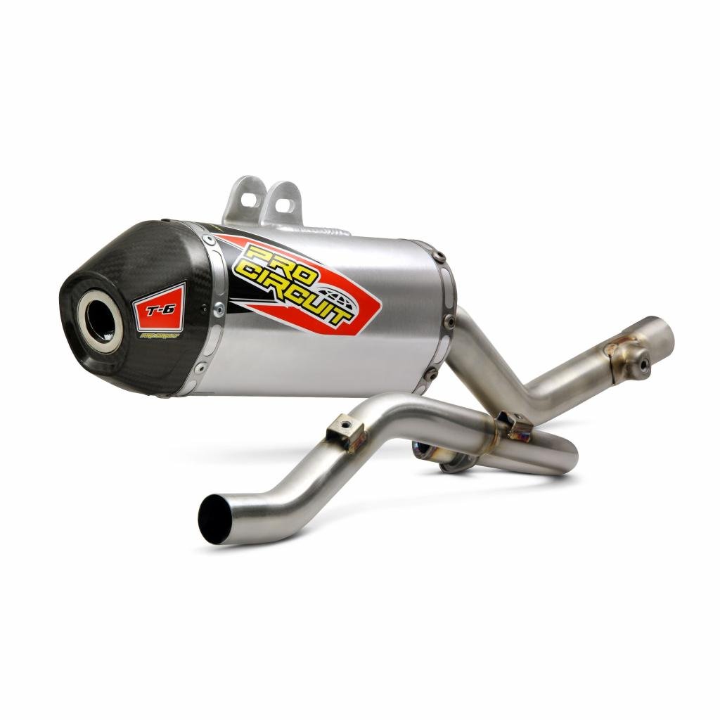 The T-6 exhaust system contains a stainless steel head pipe, brushed aluminum canister and a carbon fiber end-cap for added durability and a professional look. This exhaust system features the same benefits as the T-6 Stainless Steel Exhaust System, but is designed to fit Honda's CRF230F trail bike. In addition to all of these features, the T-6 will come with a removable United States Forest Service approved spark arrestor for trail/off-road riding.