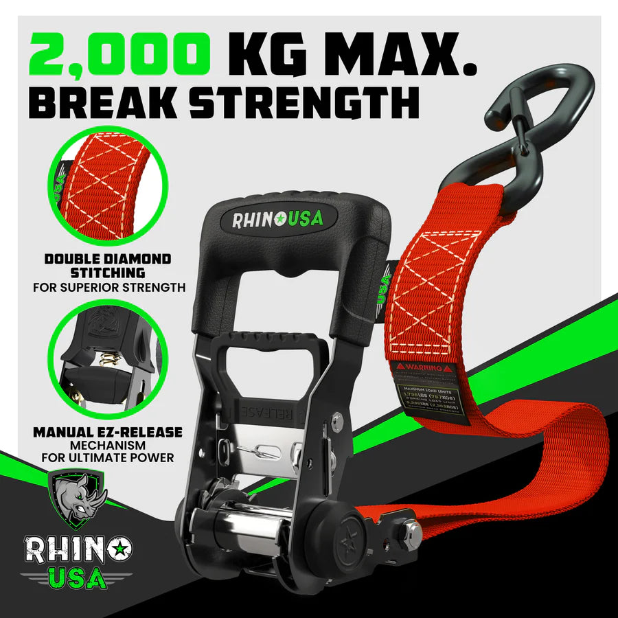 The Rhino USA Heavy Duty Ratchet Tie-Down Straps are not your ordinary, value-brand straps. They are lab-tested in the USA and offer the highest break strength rating available at 5,000lbs. All Rhino USA products are backed by a LIFETIME Warranty.
