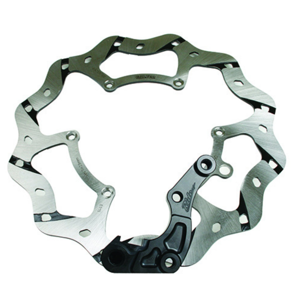 Ride Engineering's new 270mm Solid Wave Rotor is made by Galfer exclusively for Ride Eng. The special grade stainless/iron alloy material is imported from Japan, manufactured in Spain, then imported to the US. Ride Engineering machines their hanger bracket out of 6061 material ensuring a precise fit with little to no drag on the front wheel. This solid wave is made to last, is very light weight (1lb 1oz) and offers an increase in stopping power over the stock 260mm disc.