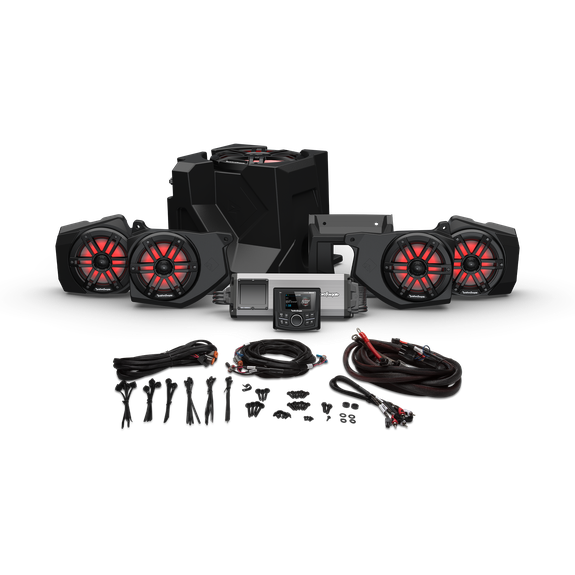 The Ranger Stage-4 is an aftermarket 1,500-watt M1 Color Optix™ front and rear audio system with subwoofer. This kit features the PMX-2 color screen multi-media source unit with Pandora® internet radio. Building on all the great features of Stage-3, this kit nearly doubles the amplifier power with the M5-1500X5. With 5 discrete channels, you’ll have full control of the 6.5” front speakers, 6.5” rear speakers, and 10” subwoofer, with future expansion of a secondary 10” subwoofer with rear-seats. A Polaris Ranger Poly Roof equipped with/without the Premium Roof Liner is required for installation of the rear speakers. The system is designed for select 2018 and newer XP 1000 FULL-SIZE (3-seat) and CREW (6-seat) models.