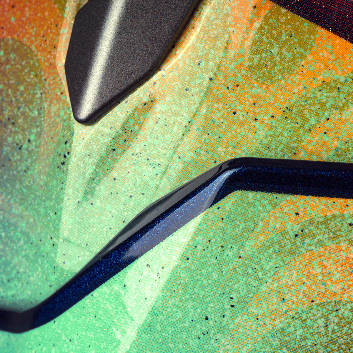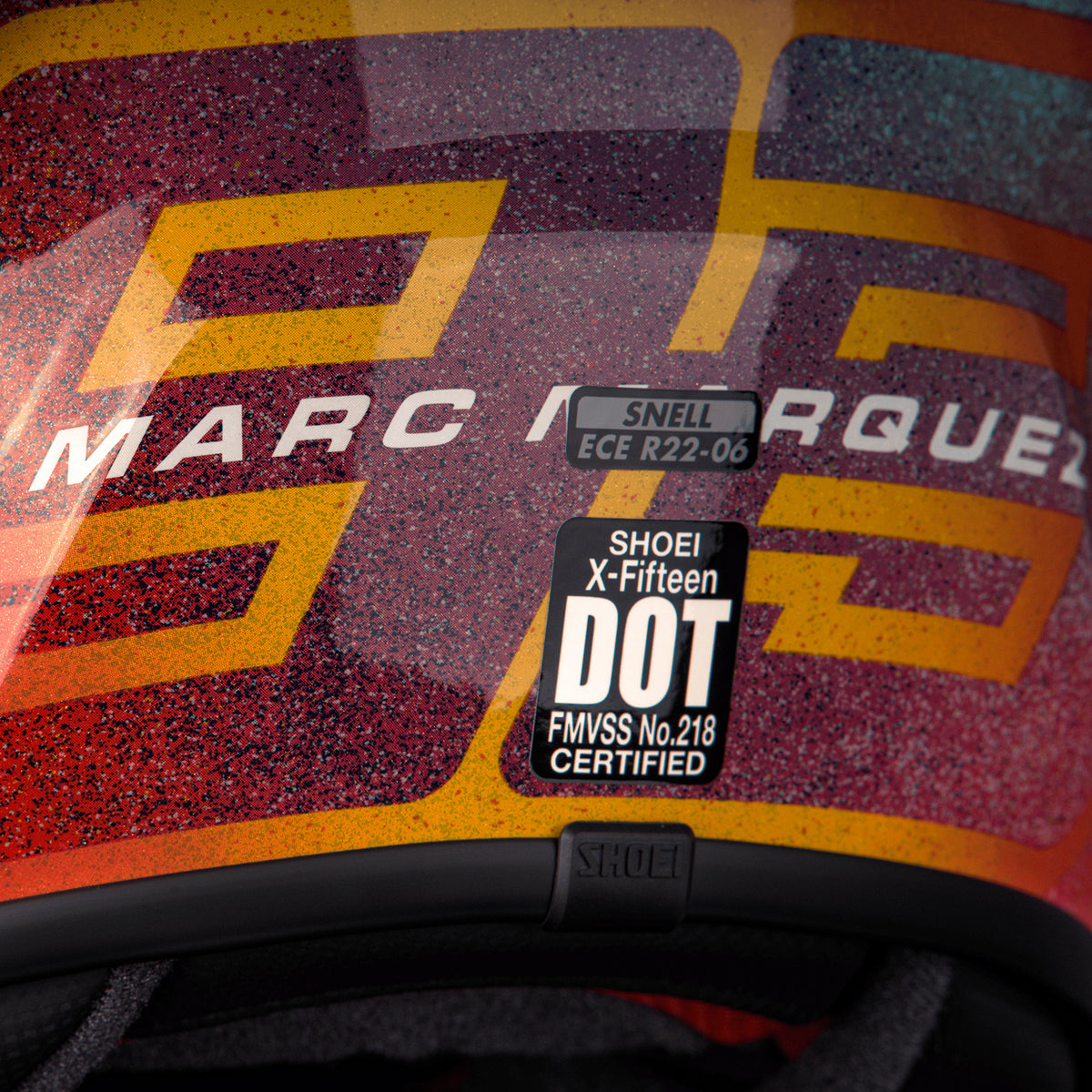 SHOEI’s top-tier X-Fifteen helmet meets the bold, energetic style of the Marquez Holi graphic for a head-turning ride at any speed.