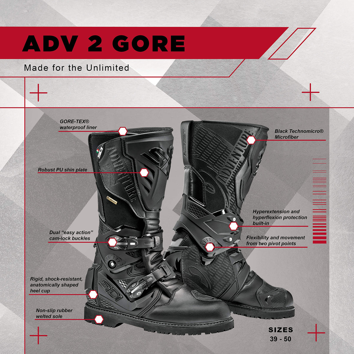 Made for the Unlimited. Embark on your next expedition with the Sidi Adventure 2 Gore Boot, where comfort, breathability, and safety converge. Tailored for the touring enthusiast with a penchant for off-road thrills, this boot is a masterclass in advanced technology and rugged design. Its Flex System offers a perfect equilibrium of flexibility for effortless movement and stability for challenging terrains. The non-slip rubber outsole provides unmatched traction, ensuring complete control in diverse conditions. Designed for versatility and endurance, the Adventure 2 Gore features a micro-adjustable buckle system, providing sustained comfort on extensive rides and making it an indispensable ally for every terrain.