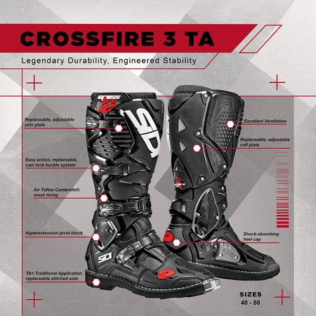 The Sidi Crossfire 3 TA Boot is a fusion of safety and comfort. Featuring advanced ankle support, a durable yet flexible design, and a TA sole for superior grip, it's ideal for motocross enthusiasts seeking top-tier performance and protection on any terrain.