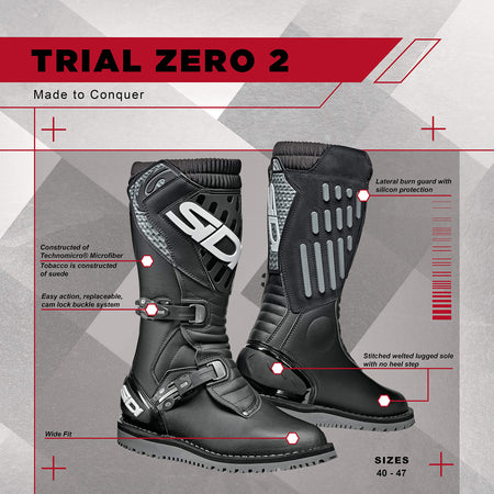 Master the trails with the Sidi Trial Zero 2 Boot, engineered for optimal balance, durability, and flexibility. Perfect for trial riders seeking superior grip and comfort in rugged terrains.