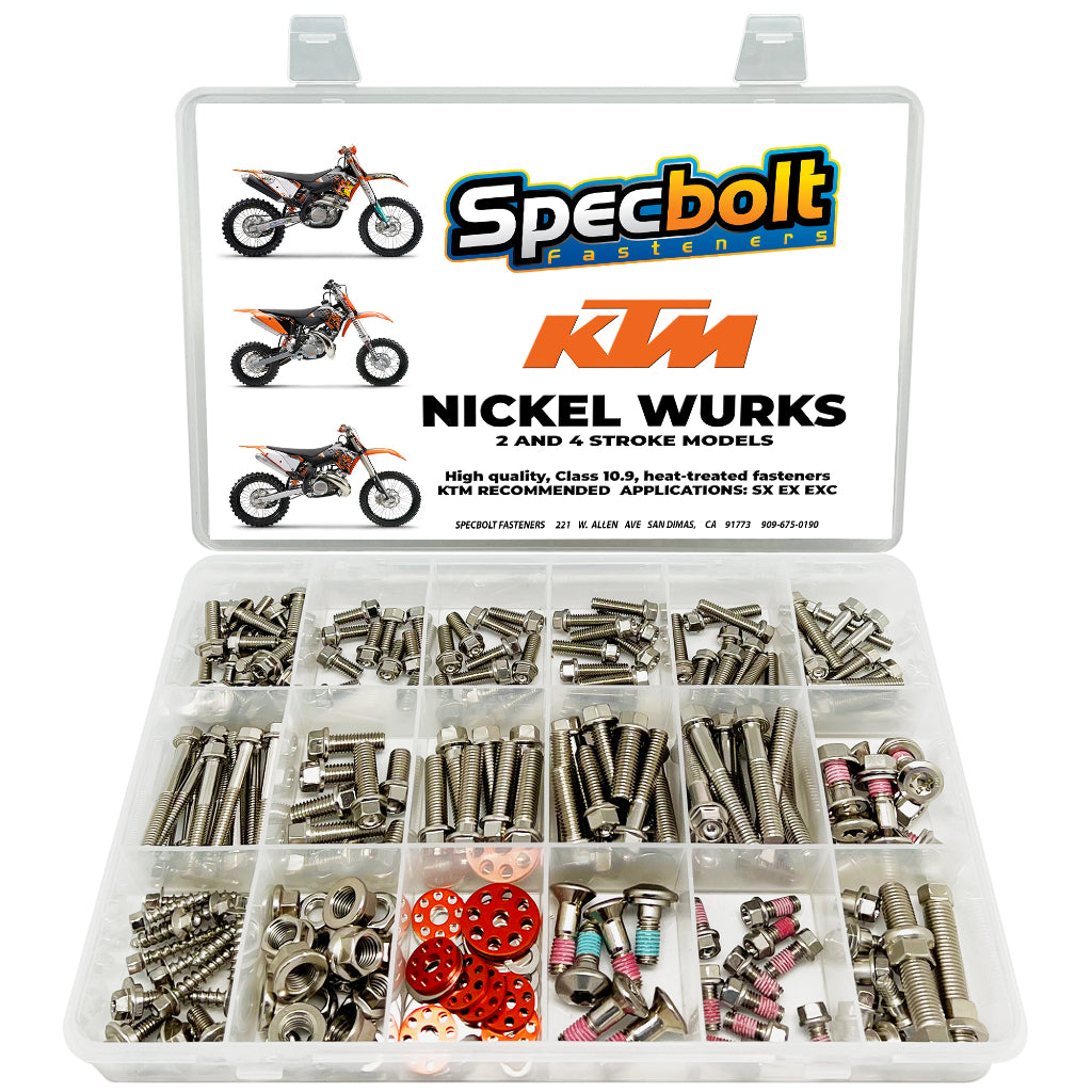 - The Specbolt Nickel Würks kit is designed to help you maintain, restore, and most importantly bling out and upgrade your original KTM OEM fasteners.