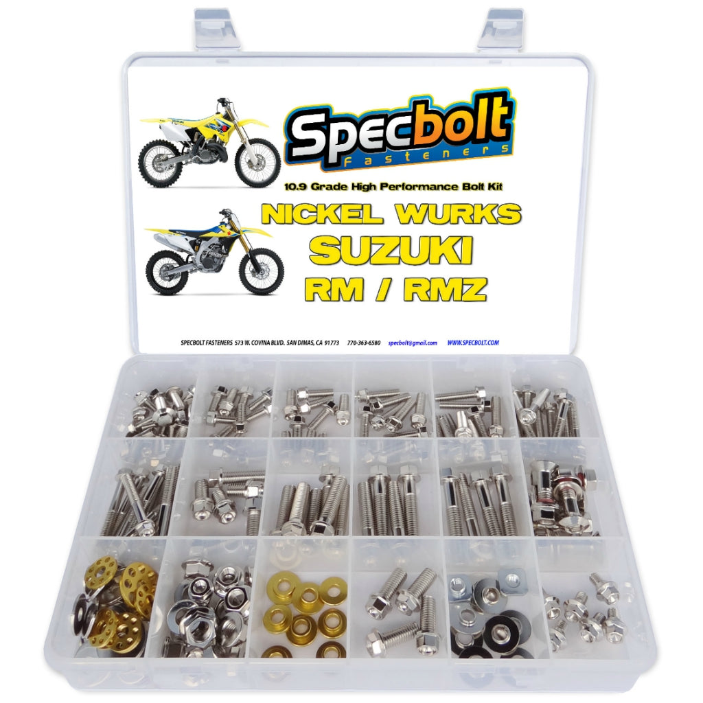 - The Specbolt Nickel Würks kit is designed to help you maintain, restore, and most importantly bling out and upgrade your original Suzuki OEM fasteners.
